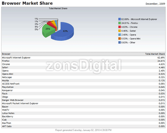 Bagaimana dengan browser yang lain? Untuk Internet Explorer (IE) keluaran Microsoft, seperti yang diperkirakan banyak orang, walau pun masih tetap merupakan browser yang paling banyak digunakan, tetapi terus mengalami penurunan, data terakhir menunjukkan bahwa penggunanya di seluruh dunia tinggal 63% saja. Sementara Mozilla Firefox tetap di peringkat kedua dengan pengguna mencapai hampir 25%, Google Chrome sudah berada di peringkat ketiga dengan angka 4.6% lebih, sedangkan Safari turun ke peringkat keempat di bawah Chrome. Ada pun browser Opera tetap di peringkat ke lima.