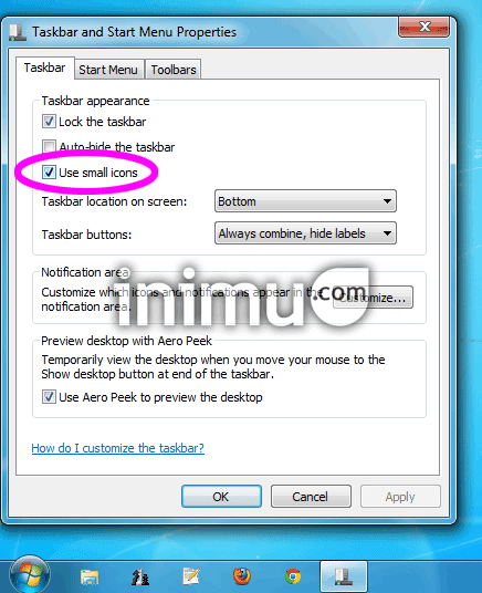 Berikut ini sekedar tips / trik ringan untuk memperkecil ukuran taskbar di Windows 7 agar tampilan area desktop di layar lebih lega, dan lebih bisa dimaksimalkan untuk jendela-jendela aplikasi.
